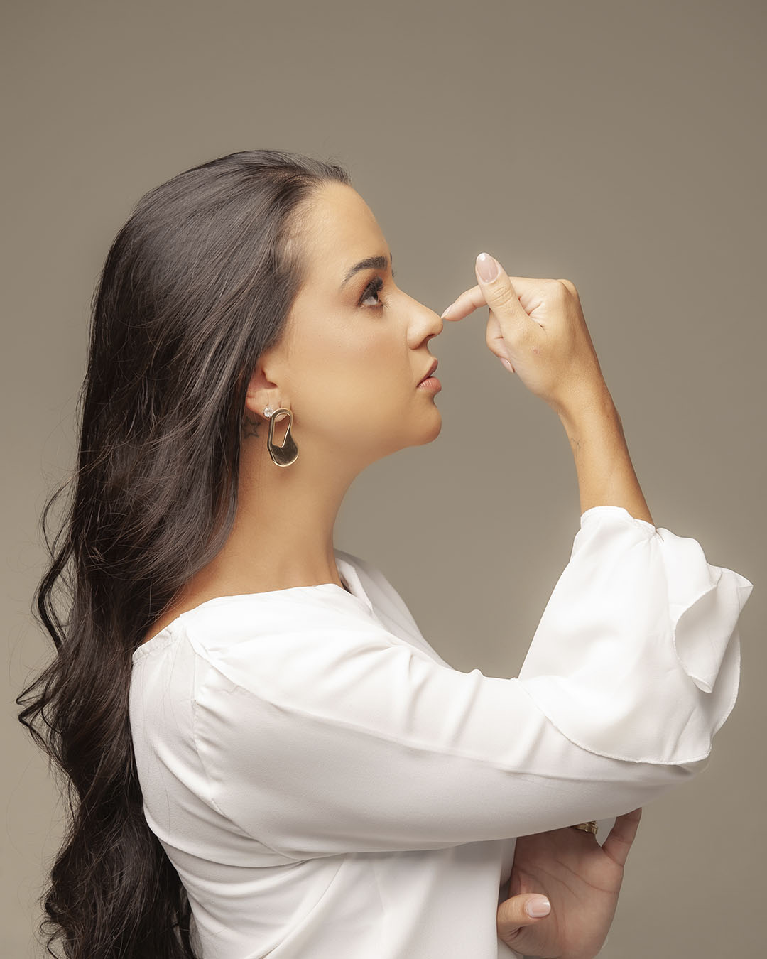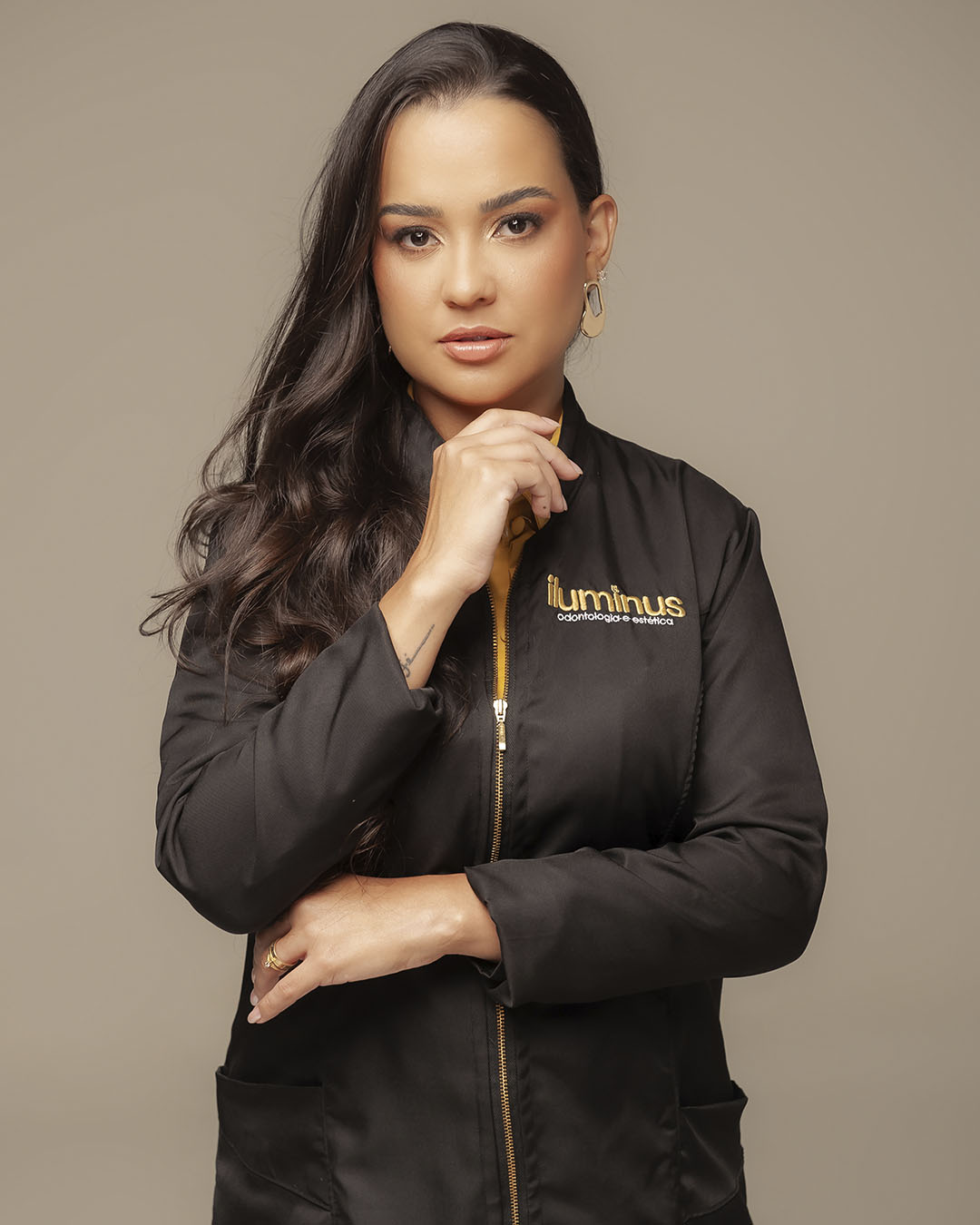 Usei fundo neutro para priorizar expressão e gesto. Quando entram elementos da área, aplico como acento visual, apenas o suficiente para contextualizar sem competir com a presença da profissional.